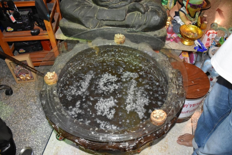 ขณะที่ บนศาลาการเปรียญ ผู้คนรวมถึงนักเสี่ยงโชค ที่ให้ความเชื่อมั่นในตัวเลขในอ่างน้ำมนต์ ตาทอง งิ้วราย ยังเนืองแน่น รุมล้อมเพื่อถ่ายภาพในอ่างน้ำมนต์ บางรายก็ใช้วิธีเขย่าเซียมซี
