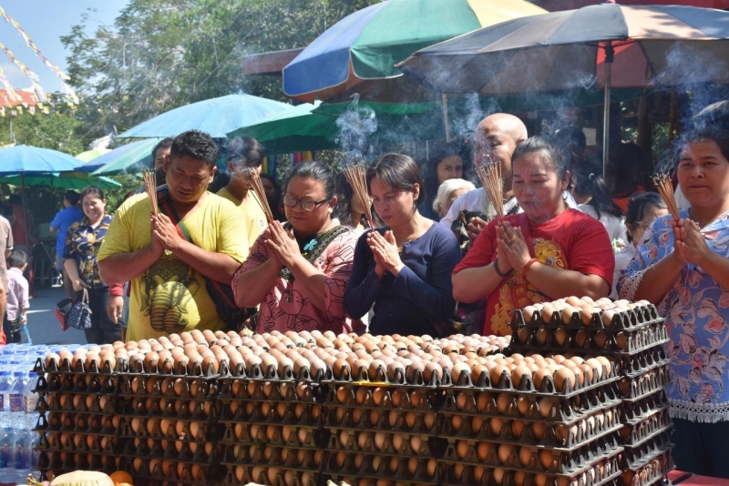 วันที่ 25 พย 62 ที่วัดสว่างอารมณ์ ต ขุนแก้ว อ นครชัยศรี นส จงรัก มืดหล้า อายุ 43 ปี ชาว อ.เมืองสมุทรสาคร แม่ค้าผลไม้ในนิคมอุตสาหกรรม สมุทรสาคร เดินทางมาพร้อมครอบครัว นำไข่ไก่สด 2,000 ฟอง และน้ำดื่ม 50 โหล มาถวายแก้บน ตาทอง งิ้วราย หลังส่องน้ำตาเทียน ใน อ่างน้ำมนต์ ของตาทอง แล้วนำไปเสี่ยงโชค ถูกรางวัลมา 3 งวดติด โดยมี พระครูยติธรรมานุยุต หรือ อาจารย์แป๊ะ เกจิอาจารย์ เจ้าอาวาส เป็นผู้ประกอบพิธีบวงสรวงแก้บนให้