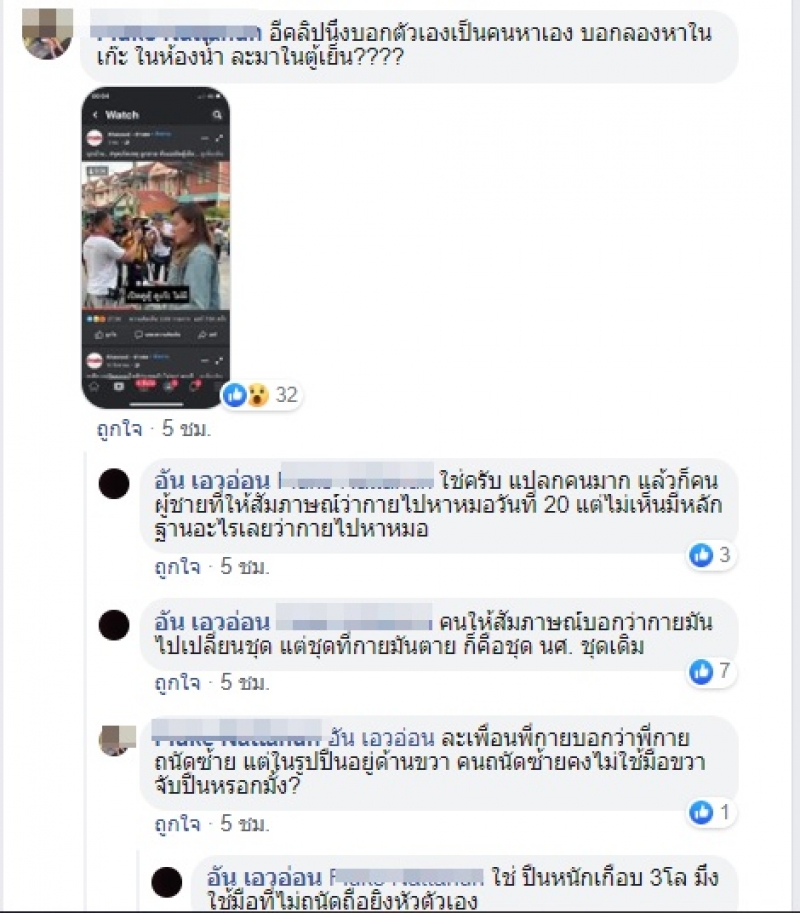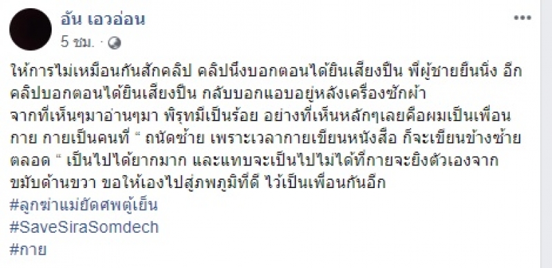 ในขณะที่เพื่อนอีกคนของนายศิระ ใช้ชื่อว่า อัน เอวอ่อน ได้ออกมาโพสต์จับพิรุธคำให้การของเพื่อนบ้าน ระบุว่า ให้การไม่เหมือนกันสักคลิป คลิปนึงบอกตอนได้ยินเสียงปืน พี่ผู้ชายยืนนิ่ง อีกคลิปบอกตอนได้ยินเสียงปืน แอบอยู่หลังเครื่องซักผ้า จากที่เห็น ๆ มา อ่าน ๆ มา พิรุธมีเป็นร้อย อย่างที่เห็นหลัก ๆ เลยคือผมเป็นเพื่อนกาย กายเป็นคนที่ถนัดซ้าย เพราะเวลากายเขียนหนังสือ ก็จะเขียนข้างซ้ายตลอด เป็นไปได้ยากมาก และแทบจะเป็นไปไม่ได้ที่กายจะยิงตัวเองจากขมับด้านขวา ขอให้เอ็งไปสู่ภพภูมิที่ดี ไว้เป็นเพื่อนกันอีก